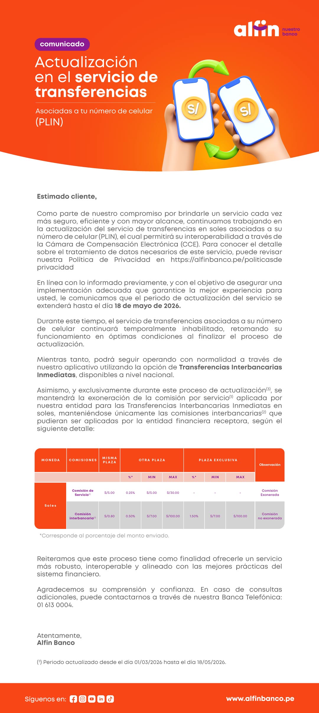 Aceptación de Términos y Condiciones: Es responsabilidad del participante leer atentamente y aceptar los Términos y Condiciones. Alfin Banco queda liberado de responsabilidad de cualquier interpretación errada a lo previsto en los términos y condiciones que anteceden. Asimismo, de acuerdo con la Ley N° 29733- Ley de Protección de Datos Personales y su reglamento aprobado D.S. N.°016-2024-JUS, el participante podrá ejercer sus derechos ARCO (Acceso, Rectificación, Cancelación u Oposición), presentando la solitud en cualquiera de nuestras agencias o nuestra página WEB (